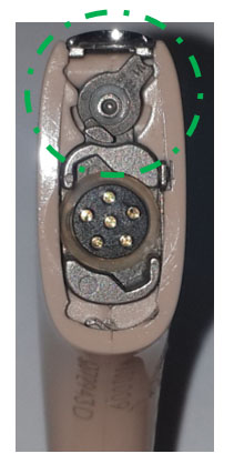2: در پروسسور دستگاه CP800 قسمتی به نام قفل (Lock) وجود داردکه سبب می شود باتری با پردازشگر کاملا متصل شود و حین بازی و فعالیت کودک از هم جدا نشوند که در شکل زیر با خط هاشور زده سبز نشان داده شده است.