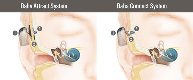 دو نوع از سیستم BAHA با نام های BAHA Connect و BAHA Attract وجود دارد که در نوع BAHA Connect پروتز به طور مستقیم از طریق ایمپلنت به استخوان وصل می شود اما در نوع BAHA Attract پروتز از طریق یک آهنربا به ایمپلنت کاشت شده وصل می شود که این نوع سیستم به علت عدم ارتباط مستقیم بین استخوان سر و فضای بیرون بسیار مورد قبول بیماران و متخصصین قرار گرفته است که در شکل زیر نشان داده شده است.